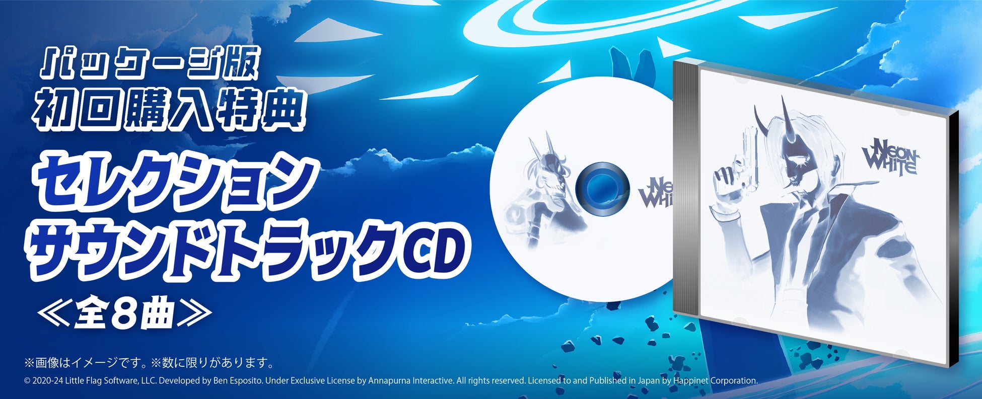 本日より全国のゲーム取扱店やオンラインショップにて予約を開始。初回購入特典として、『Neon White』のオリジナルサウンドトラックより、ゲーム開発会社「Machine Girl」セレクトの楽曲を収録したCD(全8曲)が付属します。