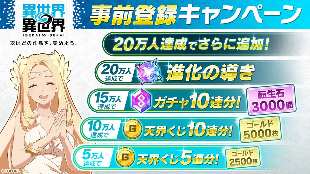 株式会社コロプラ(代表取締役社長 上席執行役員 CEO:宮本貴志、本社:東京都港区、以下「コロプラ」)は、開発中のスマートフォン&PC向け新作ゲーム『異世界∞異世界』(いせかいいせかい)のサービス開始日が2025年1月27日(月)になったことをお知らせします。あわせて、事前登録受付を各ストアで開始しております。