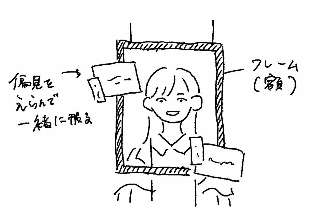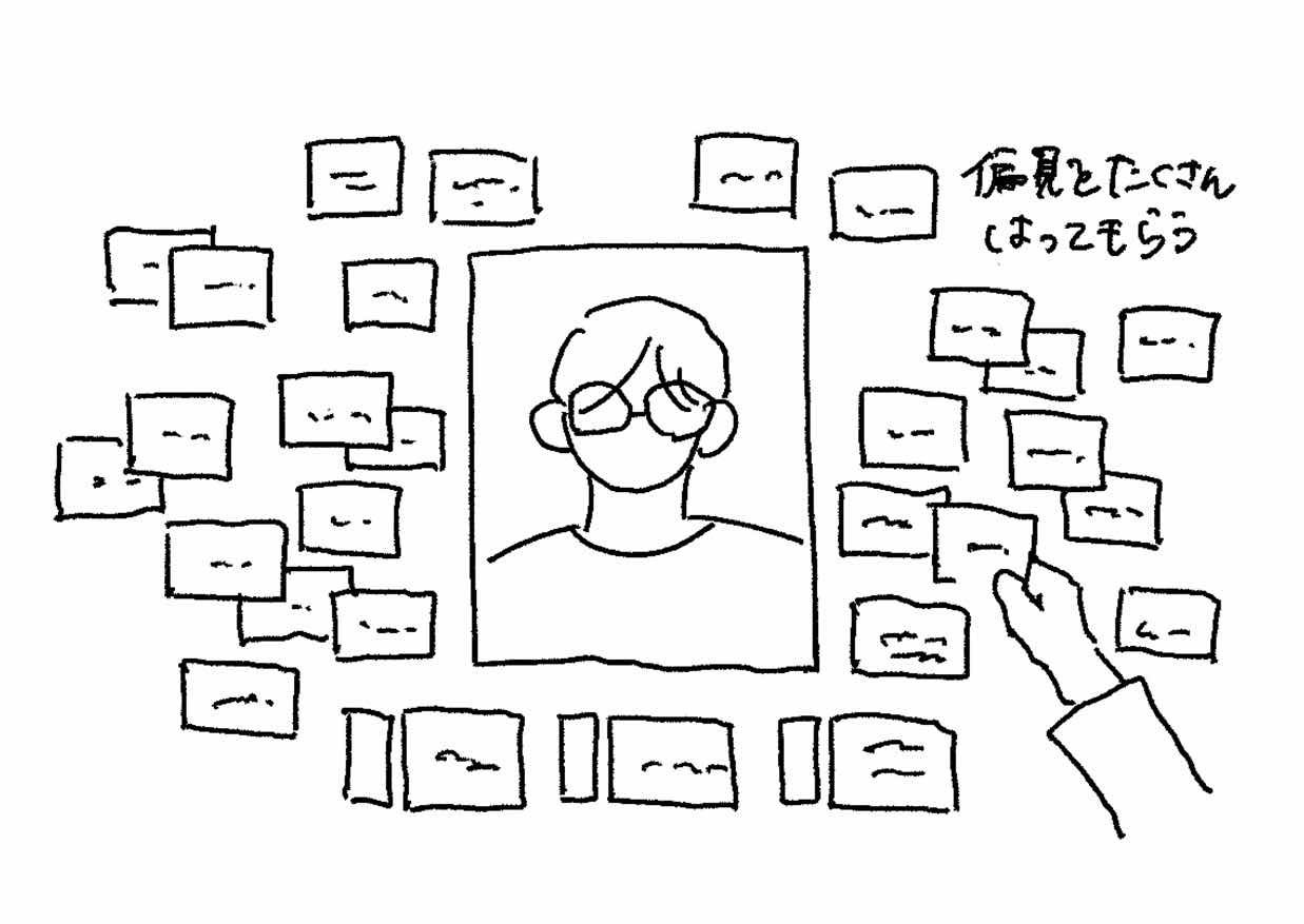 「趣味」「誰にも言っていない秘密」「最近笑ったこと」などお題の項目に沿って、見た目からプロフィールを判断。クラウドファンディングやSNSで事前募集した偏見がデフォルトで展示されていて、そこに来場者たちが会場で書いた偏見も足されていきます。日を重ねるごとにどんどん偏見が増えていくのです。飾られている偏見を「わかる〜!」と楽しむも一興。見ているうちに湧いてきた偏見を書くも一興です。あなたの書いた偏見が誰かのツボにブッ刺さるかも!?