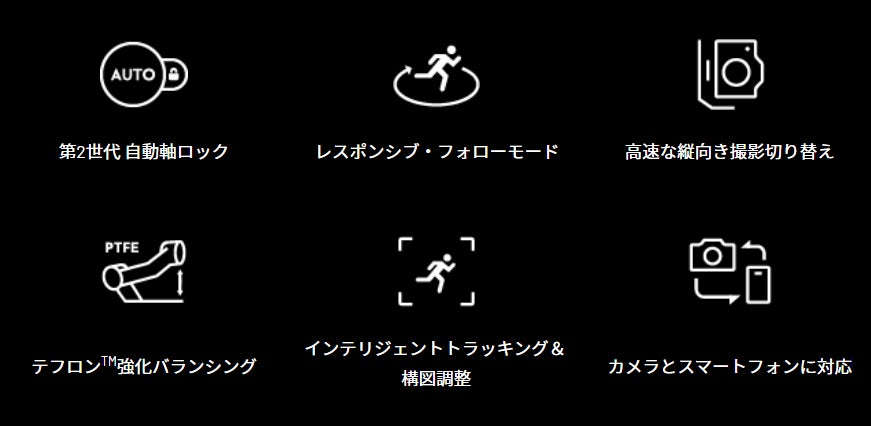 新たに搭載されたトラッキングモジュールにより、構図を自動調整でき、ジンバル初心者でも安心です。スイッチを入れたらすぐに滑らかなフォローショットが撮影可能です。