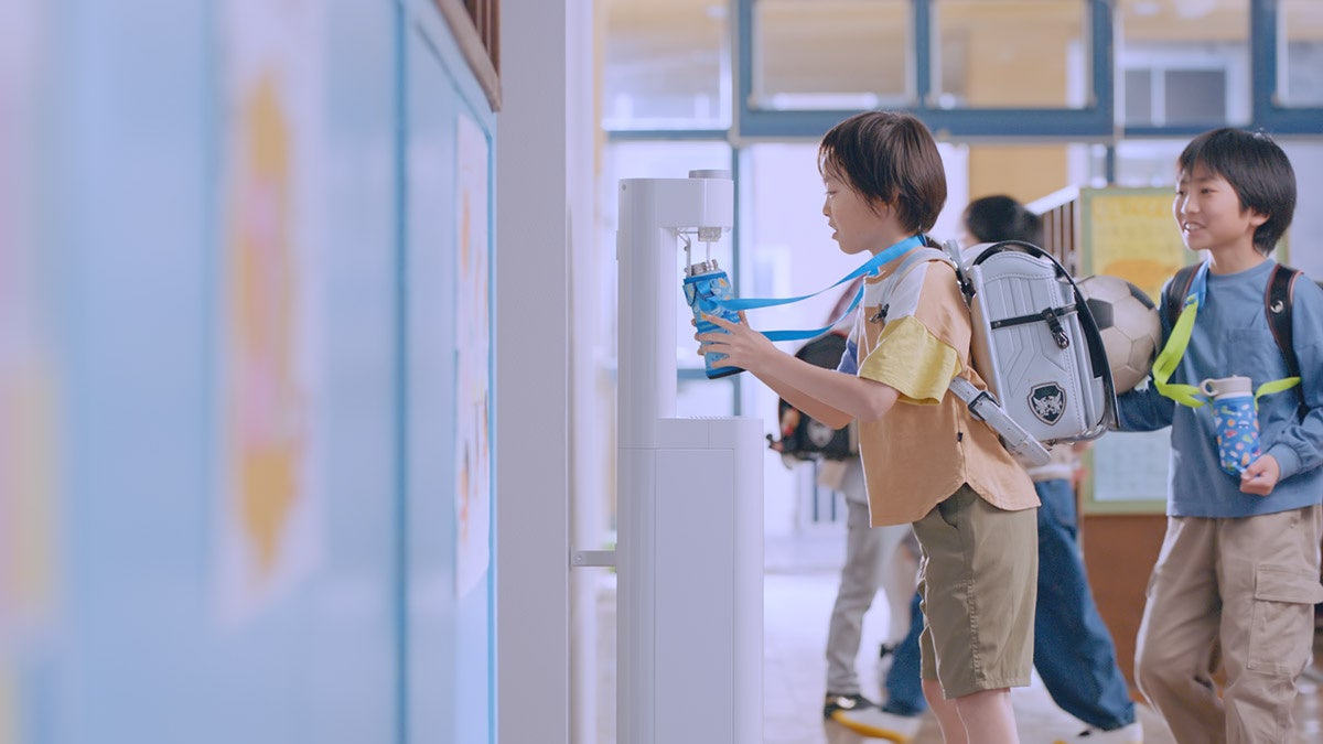 今回の新CMでは、水道直結ウォーターサーバー「ウォータースタンド」によって家庭や職場、学校、街の中のあらゆる場所で、おいしいお水を活用している未来のライフスタイルを描きました。