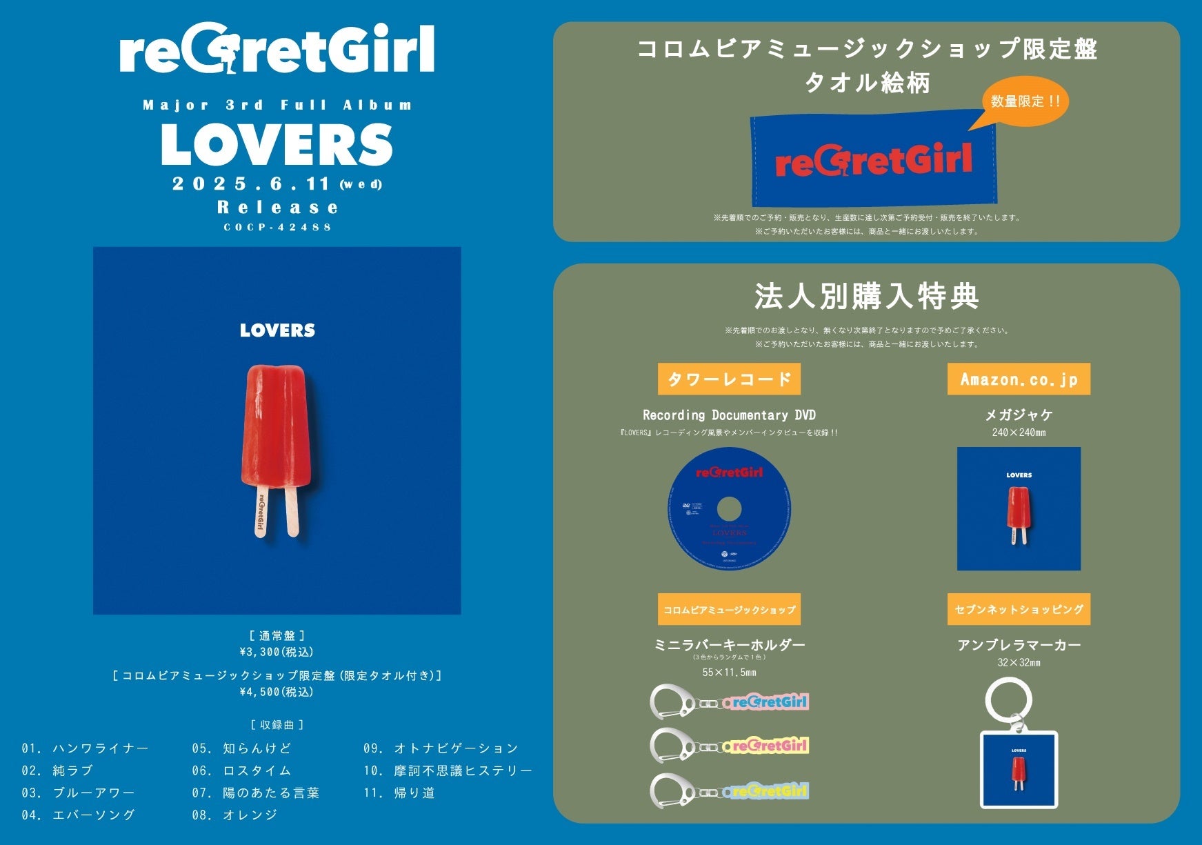2025年6月11日(水)発売reGretGirl 3rd Full Album「LOVERS」を対象店舗・ECサイトにてお買い上げの方に、先着で下記特典をプレゼントいたします。