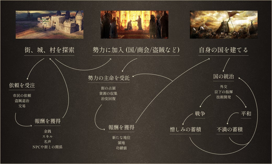 このようなキャラクター同士の関係性の変化がプレイヤーだけでなくNPC同士の間でも絶えず繰り広げられ、その結果が引き起こす様々な出来事が歴史に刻まれることにより、それぞれのプレイヤーが体験する物語は唯一無二のものとなります。