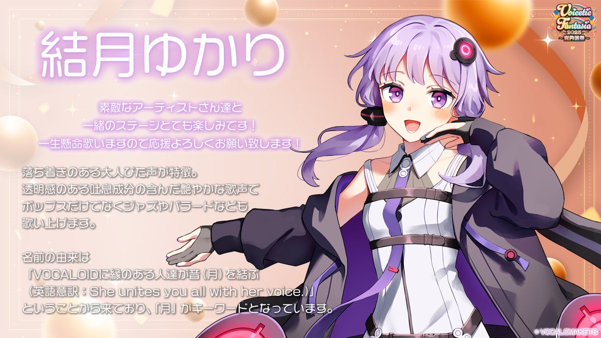 2022年~2023年のライブで主役を務めた「さとうささら」さん、「すずきつづみ」さん、「タカハシアマト」さんをイベントアンバサダーに、前回ボイファンから参加の「双葉湊音」さん、「京町セイカ」さん、「春日部つむぎ」さん、そして今年は新たに「結月ゆかり」さんをゲストに迎え、観客の皆様が笑顔になるような楽しいステージをお届けいたします。