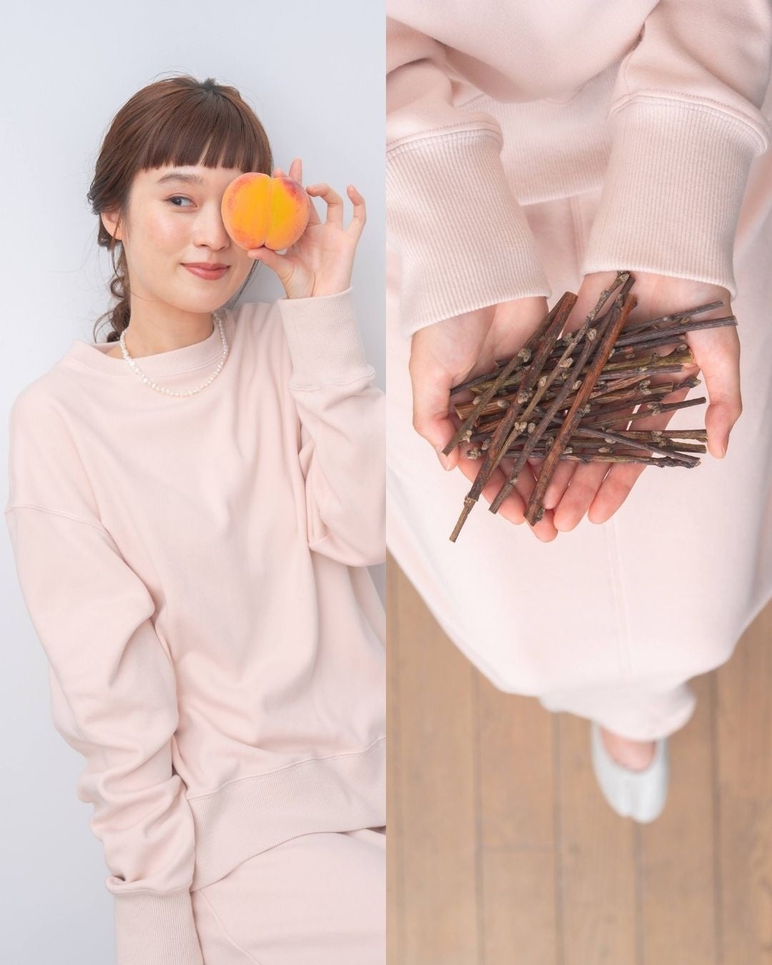 第一弾の横山農園さんのメロンの皮で染めたスウェットとスカート、第二弾の大澤果樹園さんのももの剪定枝で染めたスウェットとスカートに続き、今回は第三弾、丸茂農園さんのみかんの果皮と剪定した枝葉で染めたスウェットを販売いたします。