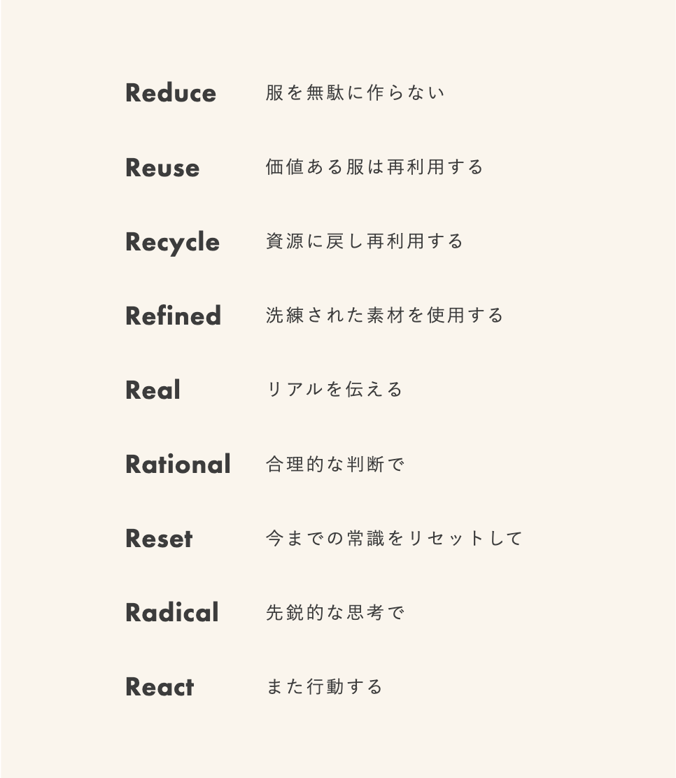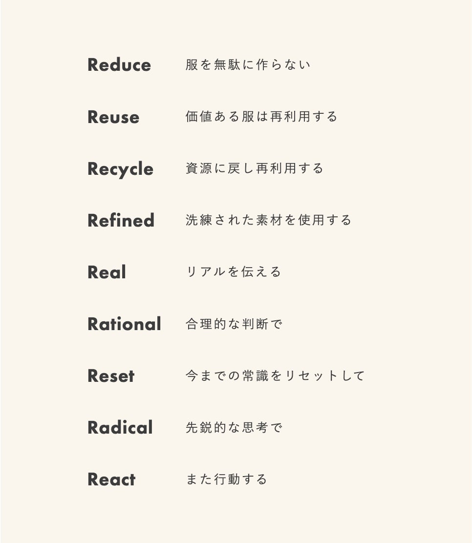 ブランドが大切にしているのは、9つのR(Refined、Real、Rational、Reset、Radical、React)。流行が過ぎると商品の価値が下がるというファッション業界の暗黙のルールとは逆に、新作発売時に早割制度を導入することで衣類の価値を守り、在庫を極力抱えないよう受注生産を軸とした販売体制を採用しています。こうした取り組みを通じて、日本のアパレル業界における持続可能なものづくりの在り方を提案しています。
