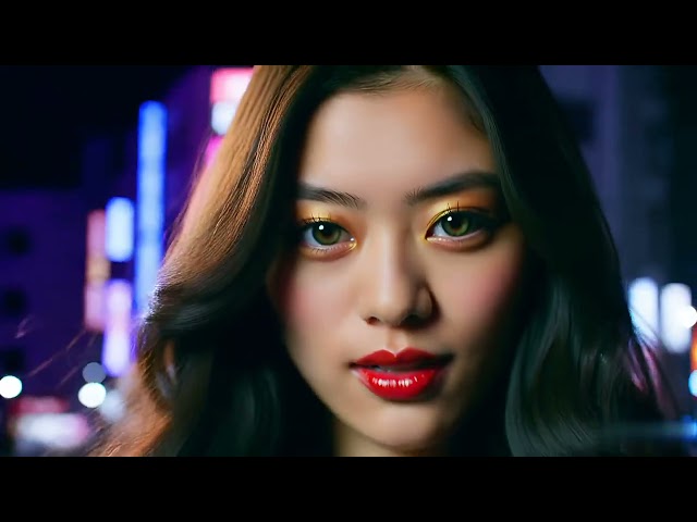 カメラがゆっくりと彼女の表情を捉えると、そこには都会のネオンが複雑に混ざり合った光の粒子が、彼女の瞳の中に美しく反射しています。ゴールドのアイシャドウが瞬きに合わせてきらめき、ウェーブのかかった豊かな黒髪が夜風に遊ぶ様子は、まるで映画のワンシーンのような完成度を誇っています。彼女の肌は滑らかで、計算し尽くされた光の当たり方が、その立体感と内側から滲み出るような艶を引き立てています。