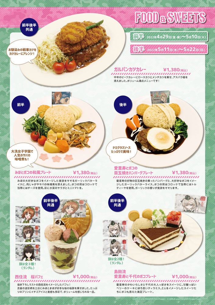 お馴染みの戦車カツをカツカレーにアレンジしたメニューをはじめ、<前半※4月29日(金・祝)~5月10日(火)> <後半※5月11日(水)~5月22日(日)>でラインナップが替わるフード、ドリンクをはじめ、西住流と島田流をイメージしたスイーツメニューなどをご用意。