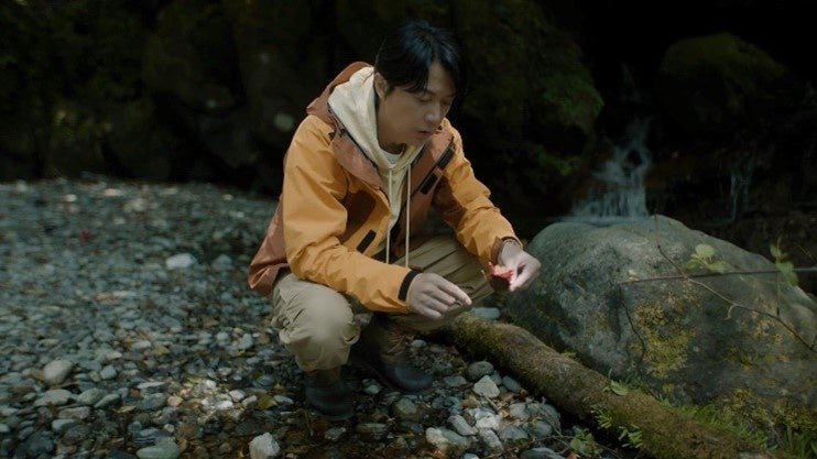 ふと水辺に何かを見つけて歩み寄る福山さん。手にしたのは木から落ち水辺に留まっていた椿の花。「水を含んでいるから、枯れずにいたんだろうね」と、たった一輪の花が示した生命の根源に水があることを体感する様子もCM本編では見られないオフショットとして公開いたします。