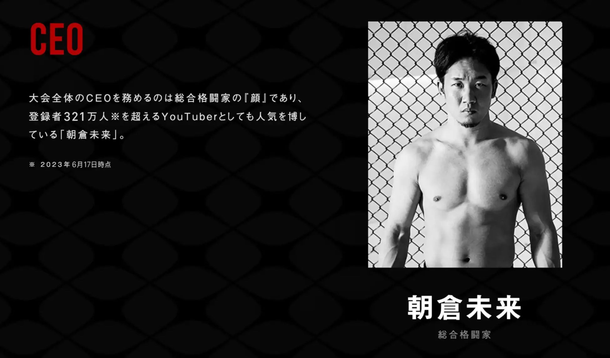 登録者数319万人超え(2023年5月15日時点)の人気YouTuberでもある総合格闘家の朝倉未来がCEOを務め、スペシャルアドバイザーとして総合格闘家の朝倉海、総合格闘家の白川陸斗が参画中。