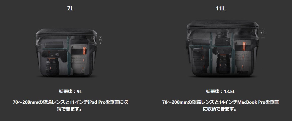 メインスリーブを拡張することで、7L/11Lともに 70-200mmレンズを垂直に収納することができます。11Lには14インチMacBook Proを垂直に入れることが可能です。