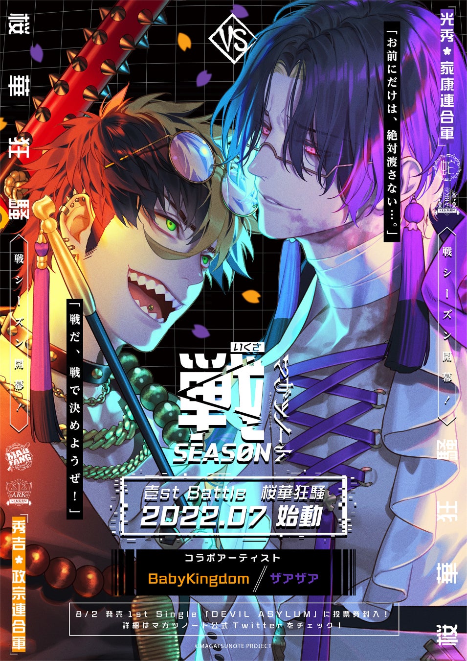 さらに、『戦シーズン 壱st Battle 「桜華狂騒」』のコラボアーティストとしてビジュアル系バンドの「ザアザア」(光秀・家康連合軍)「BabyKingdom」(秀吉・政宗連合軍)の参加が新たに決定いたしました。それぞれ新シーズンのモチーフでもある「桜」をテーマにした書き下ろしの新曲を発表予定です。