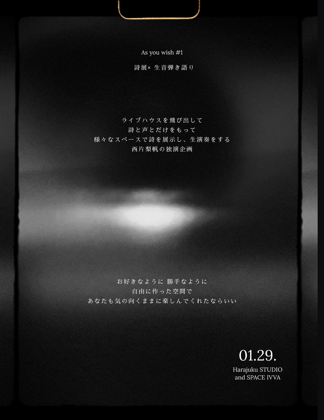 詩の世界観に注目を浴びているシンガーソングライター/表現家の西片梨帆、詩展×生音弾き語りの新企画「As you wish」の開催が決定した。本企画は、普段活動しているライブハウスを敢えて飛び出し、詩の展示と生演奏を様々なスペースで行う、まさに詩と声を持ちだした独演企画となっている。